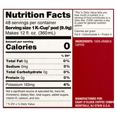 For a Serving Size of 8 fl oz 237 g How many calories are in Coffee Flavored Collection K-Cup Pods. The daily recommended intake for potassium is 4700mg. For a Serving Size of 8 fl oz 237 g How many calories are in Coffee Hazelnut Creme K-Cup Pods.